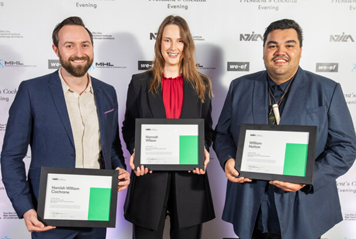 Hamish Cochrane, Hannah Wilson and William Hatton were recognised for successfully passing their New Zealand Institute of Landscape Architects Tuia Pito Ora (NZILA) Registration interview.