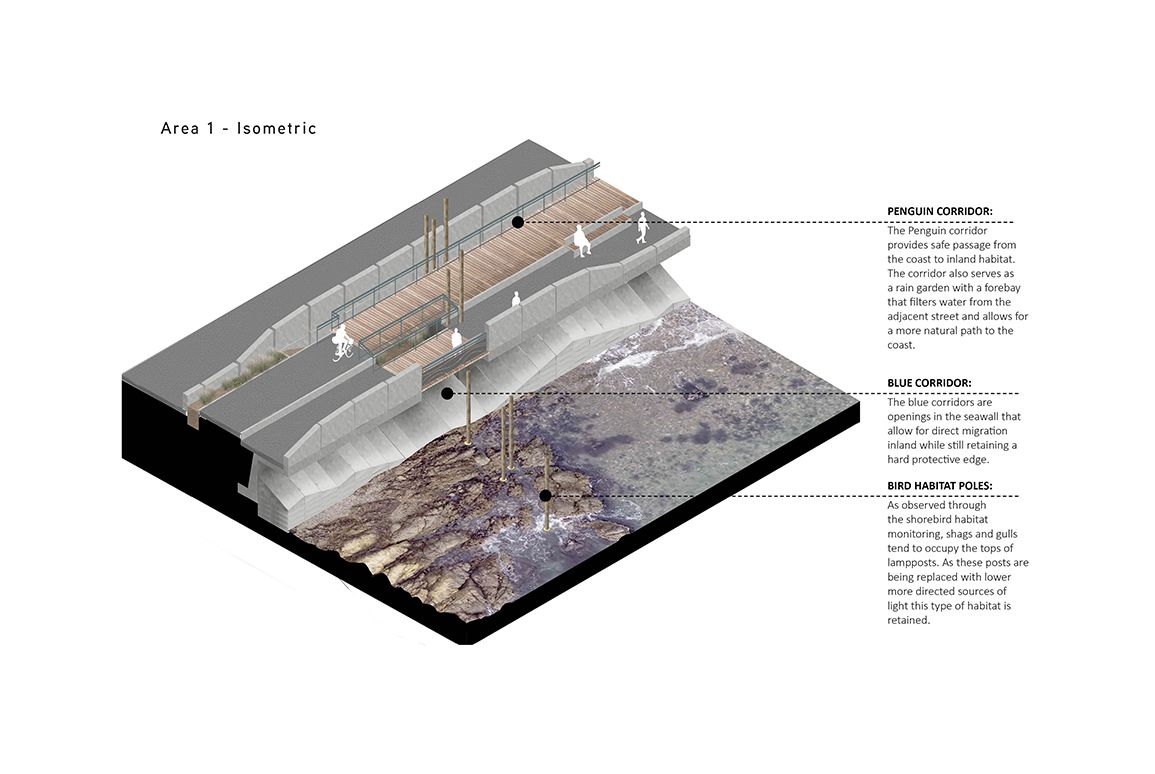"This project shows how design can minimise the restriction of inland migration of intertidal species along urban coastlines; especially where coastal infrastructure such as seawalls have been created. Connor’s research included mapping species distribution and behaviour and testing design pro Waikato Regional Seascape Study within the Coastal Marine Area totypes that increase habitat for intertidal species. Design outcomes include penguin passage corridors, intertidal habitat corridors for shellfish, and bird habitat poles.