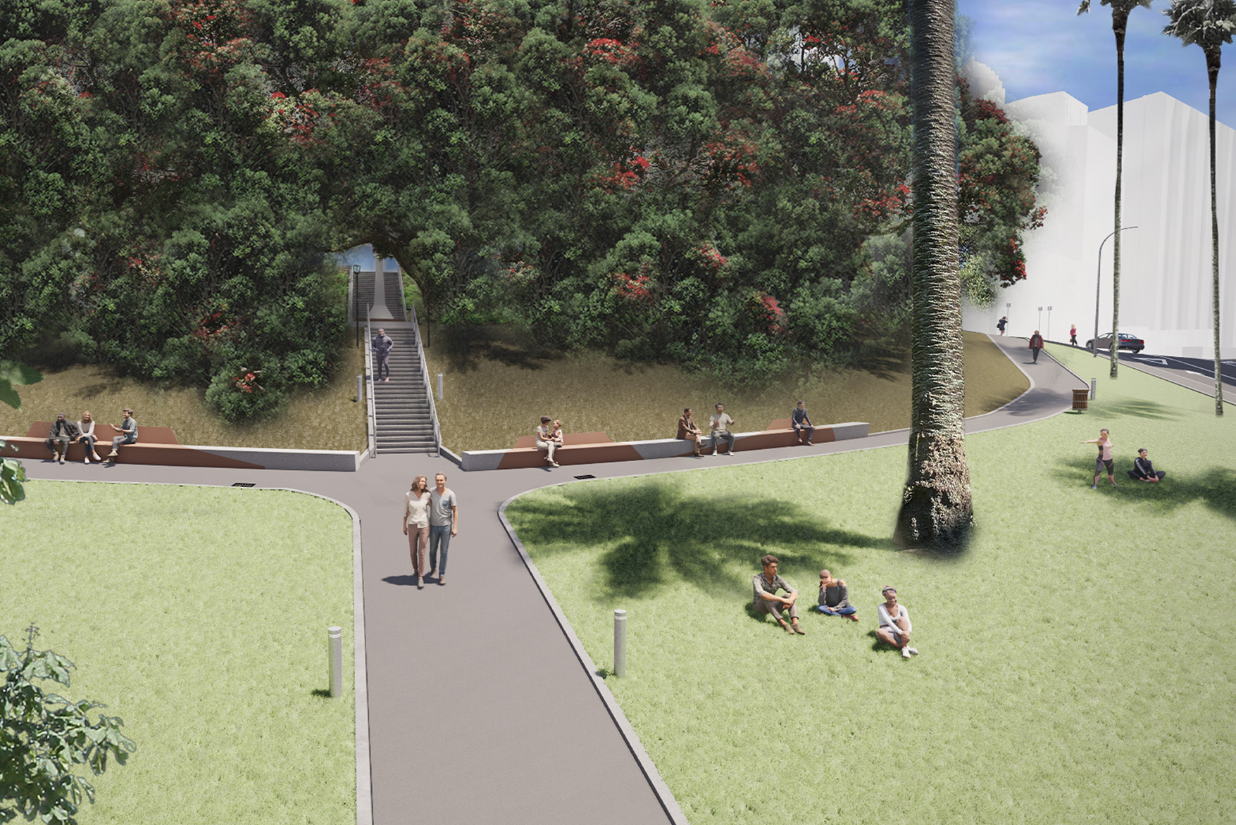The concept layout focuses on creating spaces for different user groups. A new centrally positioned community plaza will serve as an extension of the reserve's open lawn space, envisioned for large gatherings, events, music, and cultural activities. Terraced spaces and smaller respite areas surrounded by native plants and trees will provide quieter spots for individuals seeking relaxation. To connect these spaces and strengthen the reserve's value as an urban green space, more native plantings will be introduced throughout the site.