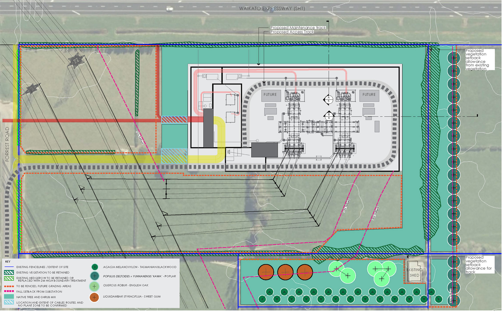 This design proposes a range of native trees and shrubs around the perimeter of the GXP to provide visual screening and soften the appearance of the project in the landscape. This landscape design also incorporates fast growing exotic trees species in accordance with the recommendations of Boffa Miskell’s ecologists in order to over time improve habitat for the Threatened – Nationally Critical native long-tailed bats which are present within the site and surrounding area.