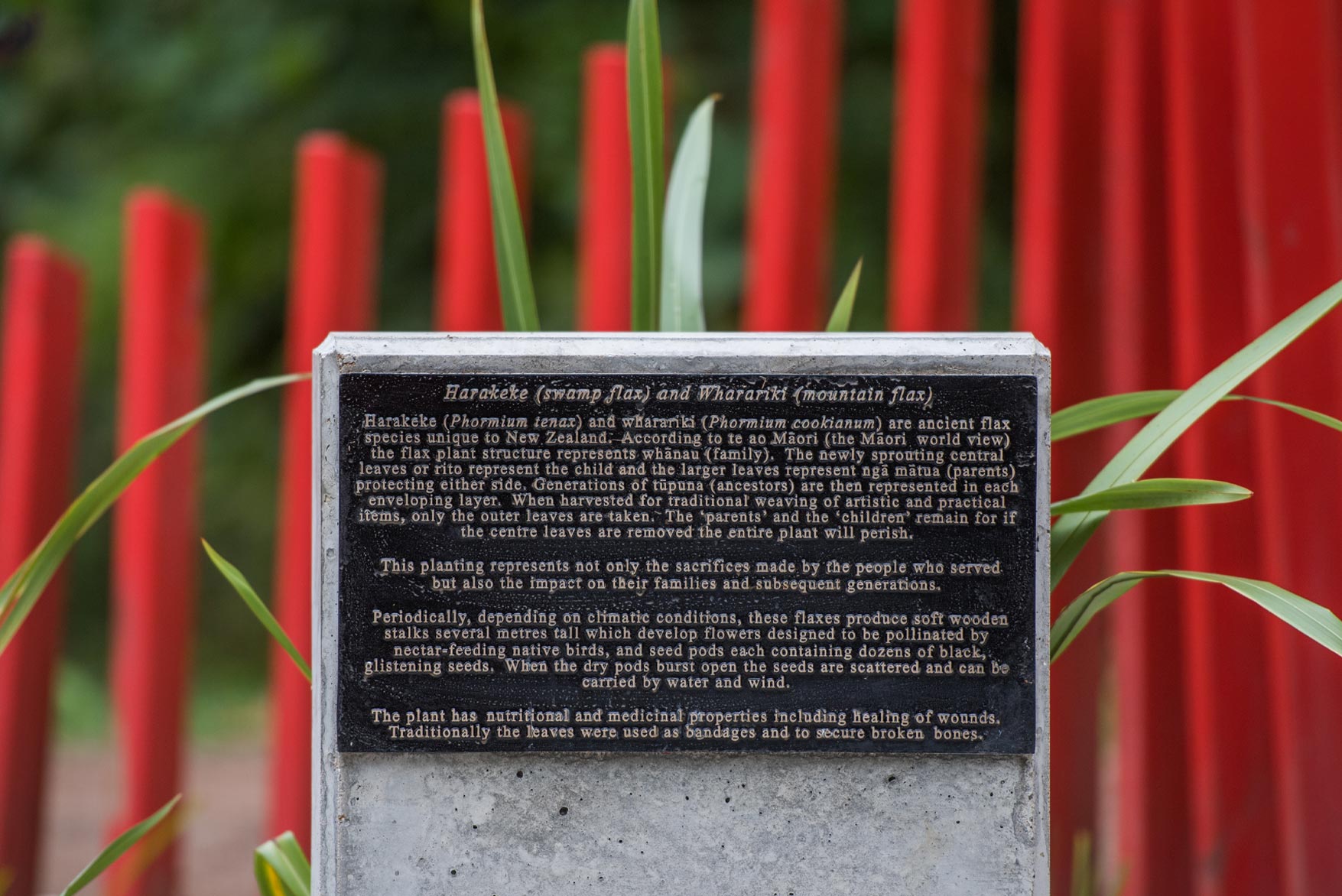 Remembrance through planting comprises a flax swathe, and a planting curve. Iconic plants of New Zealand – flax, rātā and mānuka – were chosen for the design.