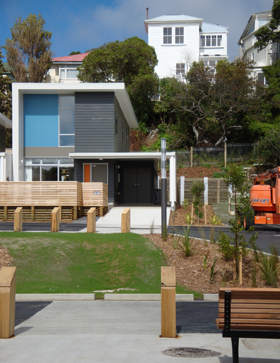 The central bioswale is a focus for the development of the circulation pattern and as an element of sustainable design, a point for community meetings and a visual amenity. The proposed vegetation for this area is predominantly wetland species of Phormium tenax (flax), Carex secta, Eleocharis sphacelata (bamboo spike-sedge) and other sedges that will take periodic inundation or wet ground, as well as taller woody species such as Laurelia novae-zelandiae (Pukatea) and Cordyline australis (ti kouka) that will reflect the ground conditions and give a distinctive vegetation type for the development.