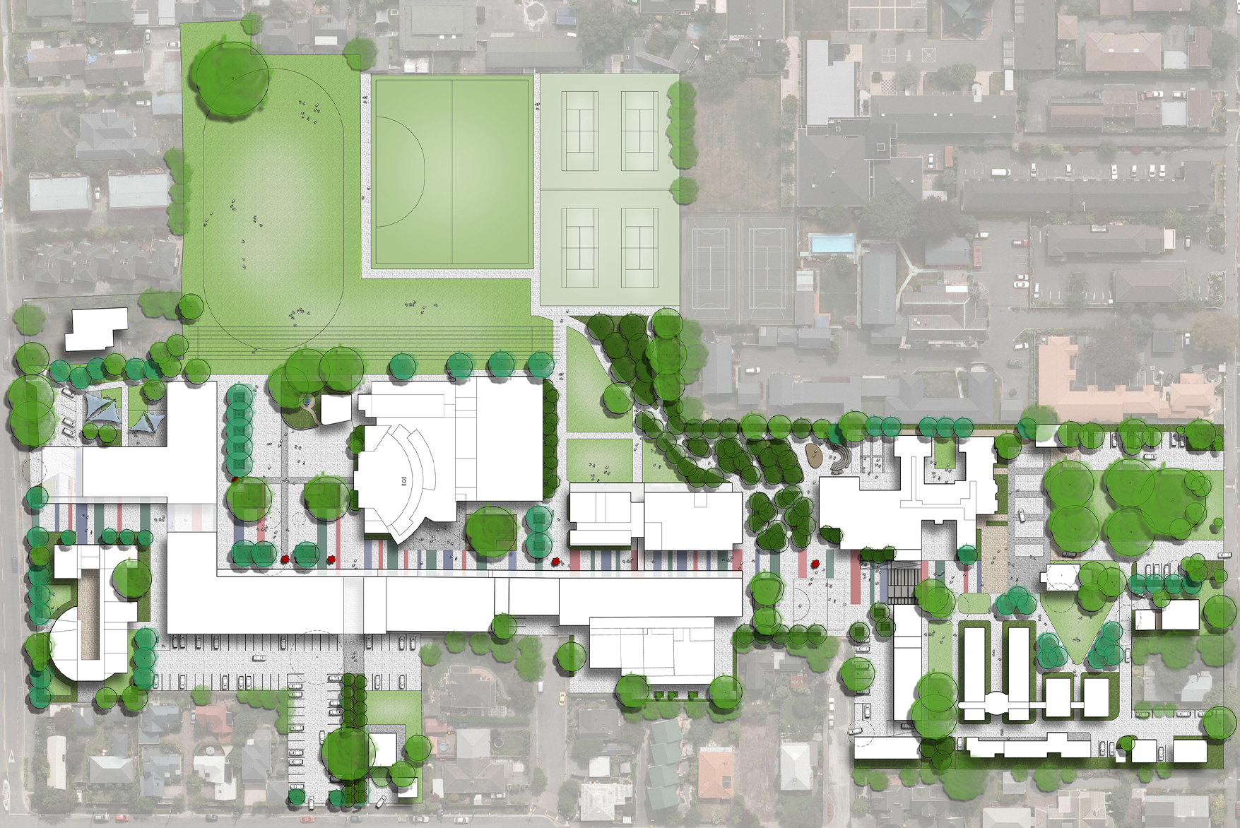 Students at St Margaret’s range from pre-school through to high school age, and the junior, middle and senior schools all have very different spatial needs. The masterplan was developed to accommodate the requirements of each, while allowing for visibility and integration between the three schools as one unit.