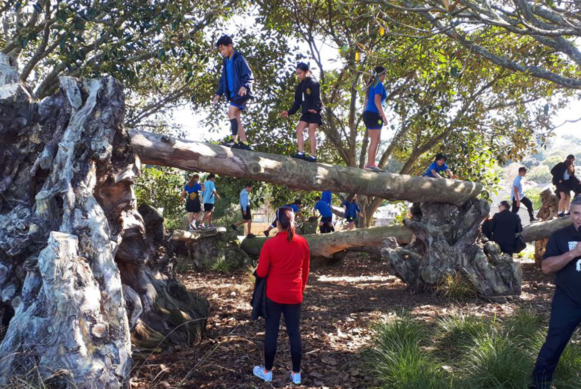 Community leaders, local school children, and Local Board members were at the opening; and while the children swarmed over the various aro tākaro , Harko Brown encouraged three intrepid local board members to complete a traditional exercise of climbing the kōpapa as a team.