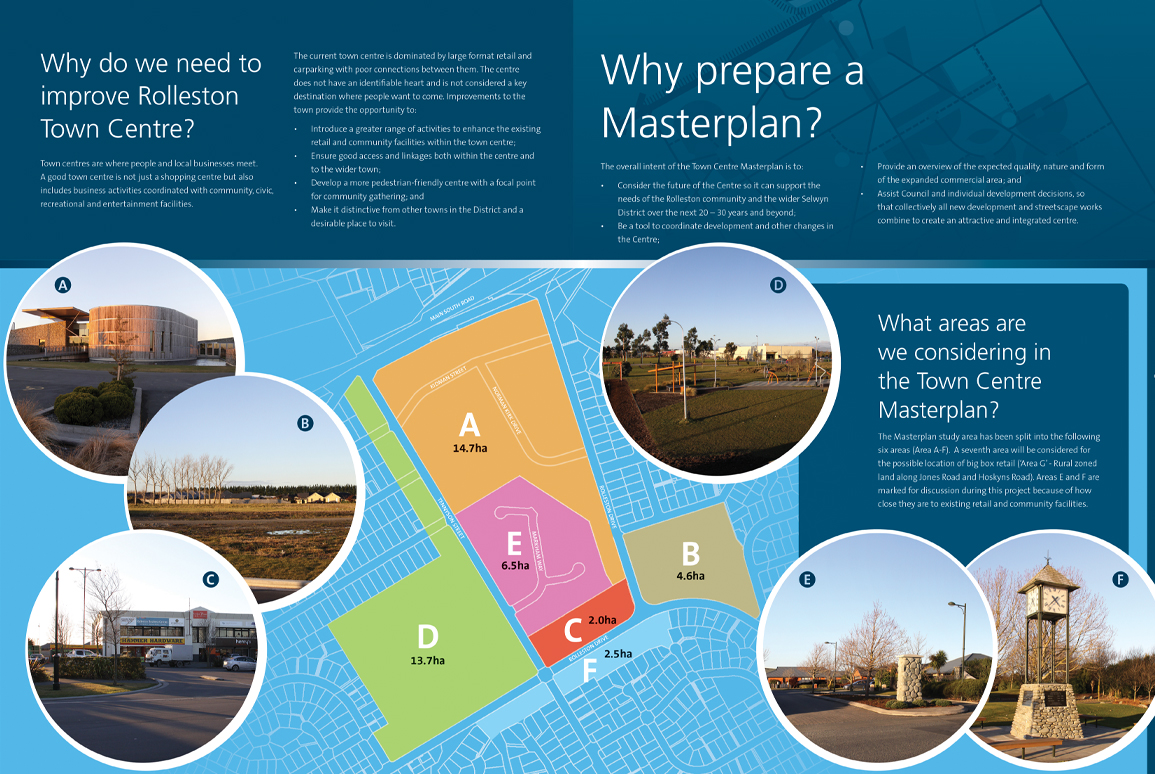 Rolleston town centre master plan South of Christchurch, the Selwyn District Council has engaged the Christchurch Design Team to assist in preparing the Rolleston Town Centre Master Plan. Still in its early stages, the master plan will have to ensure the town centre can support the needs of both the rapidly growing town and the district-wide community over the next 20-30 years. It will be a tool to coordinate development, provide a benchmark for expected quality and assist the Council with individual development proposals.