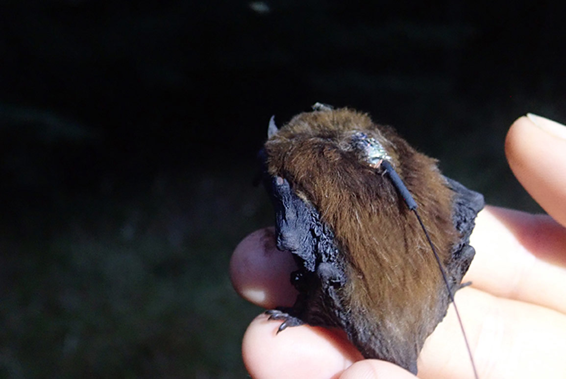 As long-tailed bats usually change roosts nightly, high frequency transmitters are used to locate new trees each morning. Bats are initially caught in free standing harp traps (a specialist bat trap made of parallel strands of fishing line which is undetectable by echolocation) to attach a transmitter to a lactating female. The following morning, she is radio-tracked to a tree and a potential roost hole is identified. Traps are set up covering the roost entrance and the waiting game begins.