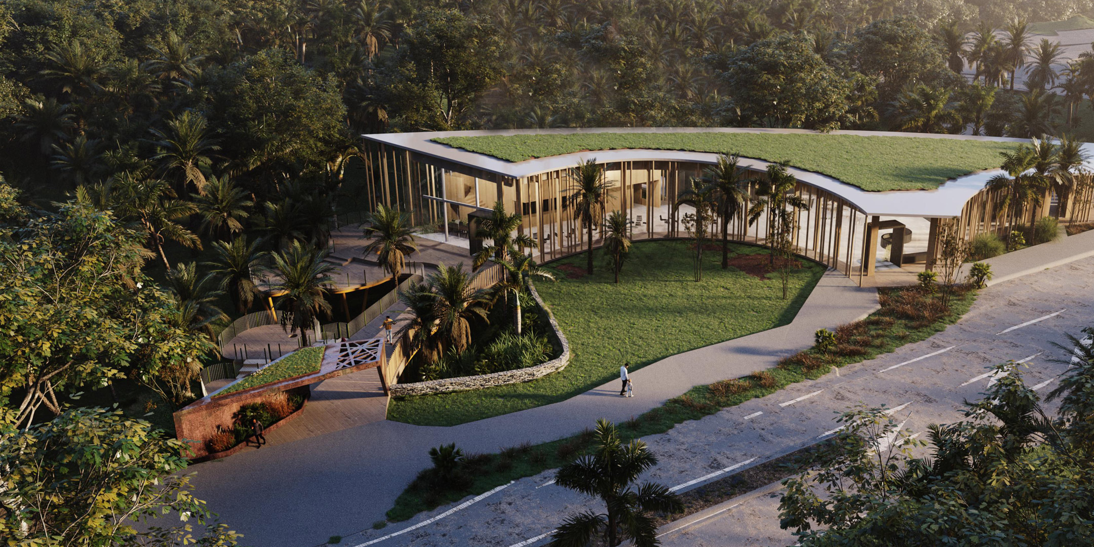 The journey to Punakaiki from both the north and the south winds along a coastline of raw nature. As you round the bend into Dolomite Point, your first glimpse of Punangairi is a forest of vertical columns set amongst established nīkau, topped with a slim aluminium-clad barge. Peeking over the top of this glistening barge are the hints of the green roof so visible in aerial photography, with nīkau and the bush-clad hills beyond.
