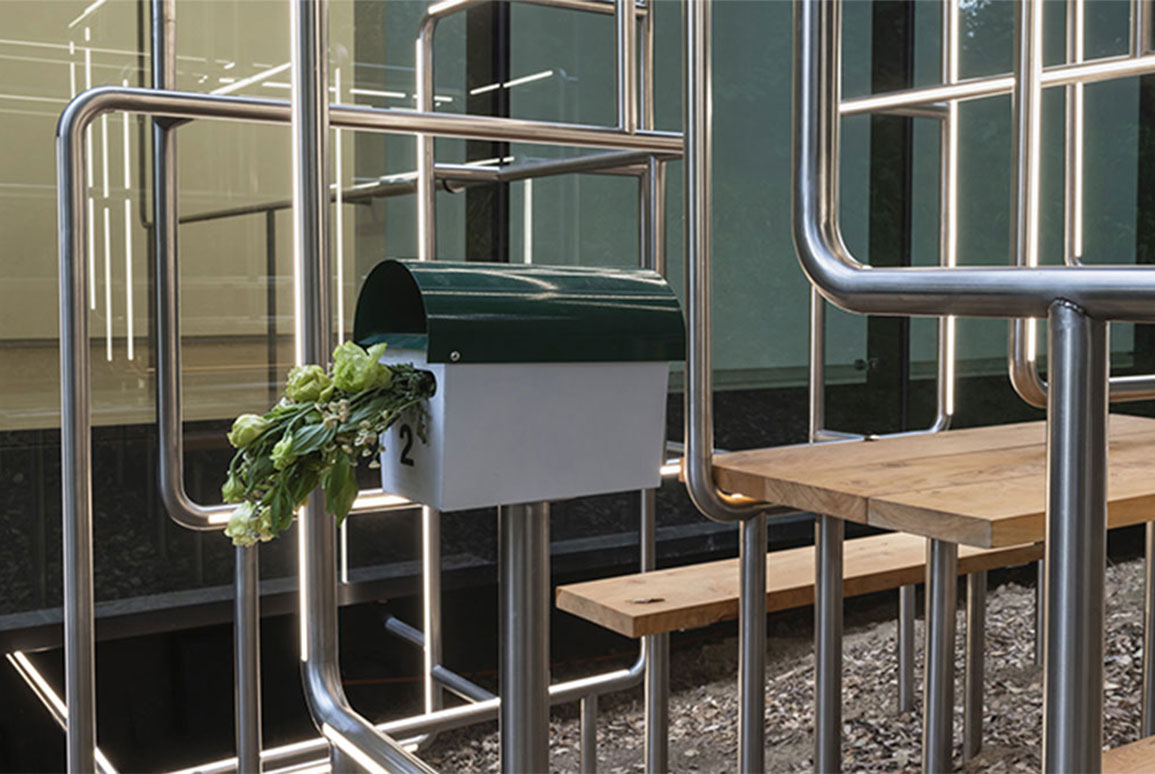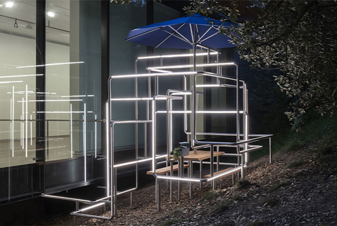 The artwork is an extension of an exhibit by artist in the East Gallery (Yona Lee: An Arrangement for 5 Rooms) which appears as though it extends through the glass into Albert Park.