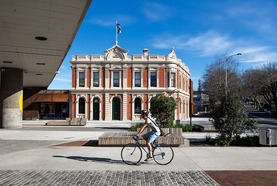 The public realm south of the park was also enhanced by realigning Franklin Road and narrowing Union Street to create the new Wai-atarau Plaza. The plaza was designed as a setting for the historic, relocated and restored Rob Roy Hotel - providing a new focal area adjacent to the Victoria Park Markets and visually connected to Victoria Park opposite.