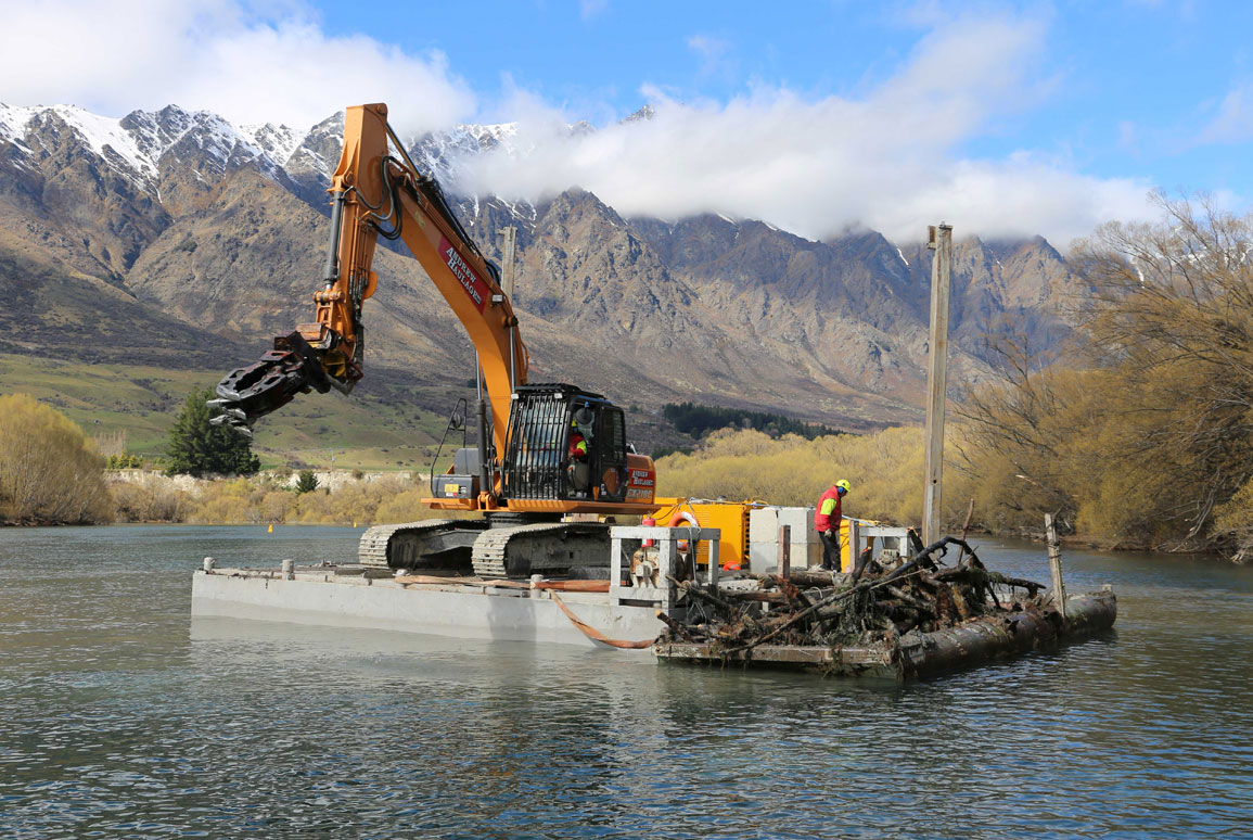At first, it was thought that divers could manually remove the willows, but the sheer volume of material made this unsafe, and impractical. Instead, Otago Regional Council funded a large barge with a 24-ton digger to remove over 150 tons of woody vegetation from the riverbed.