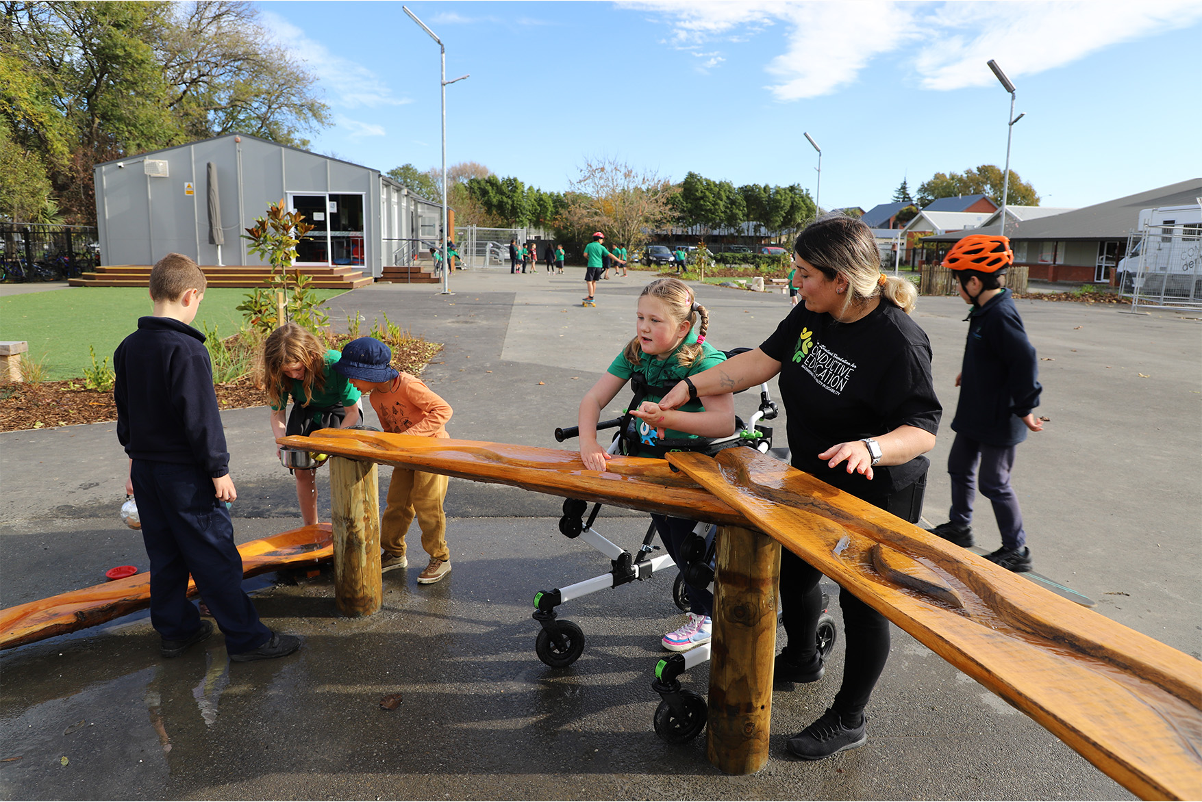 School principal Donna Buchanan says, "Our students and community love the playground. The sounds of children playing in spaces that reflect their interests, needs, ages and stages warms our heart. We have less playground problems because students have their needs met in so many different ways, in spacious and defined areas. The water race and sandpit are incredibly popular."