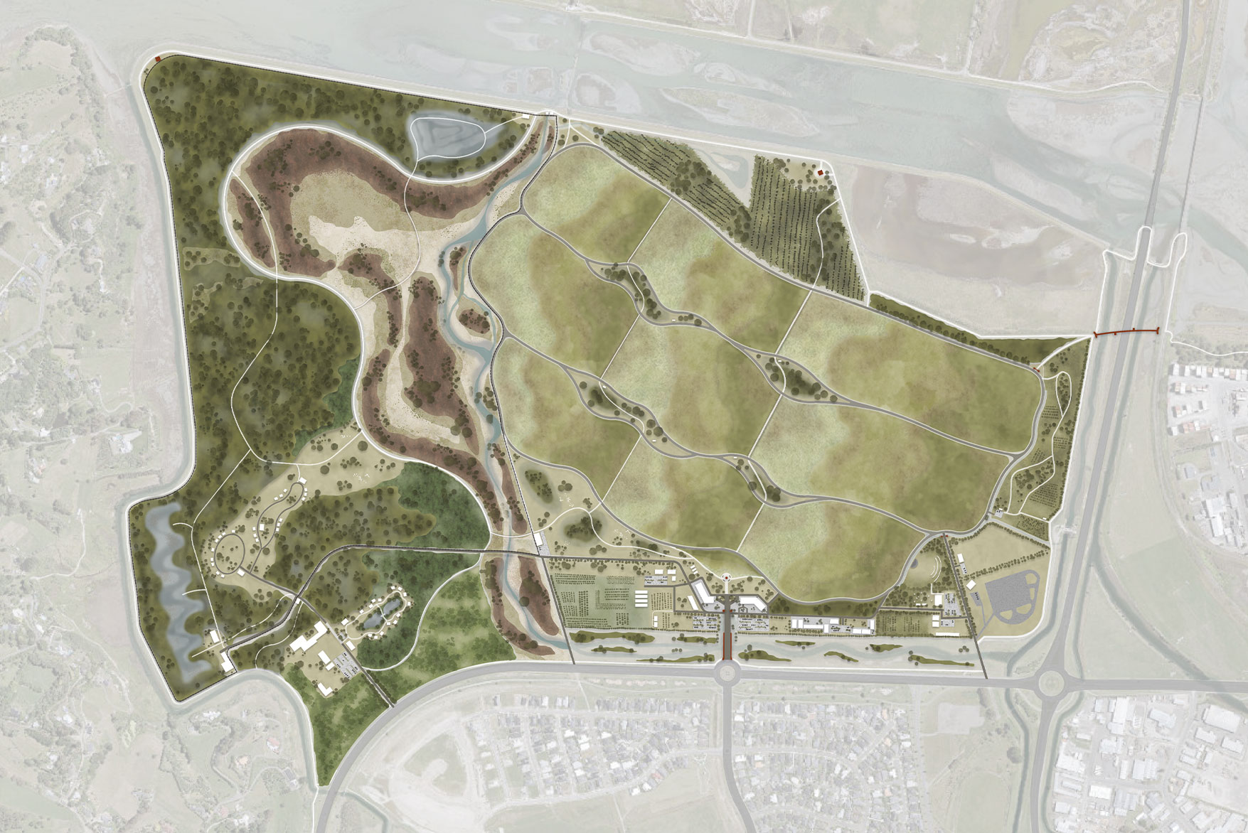 The heart of the masterplan is developing an extensive stormwater treatment wetland system. This system is designed to filter urban stormwater before it reaches the estuary, improving water quality and enhancing climate resilience. Beyond water treatment, the park aims to revitalise the landscape through ecological restoration, the revival of mahinga kai practices, cultural storytelling, and the creation of environmentally sensitive recreational spaces that serve both current and future generations.