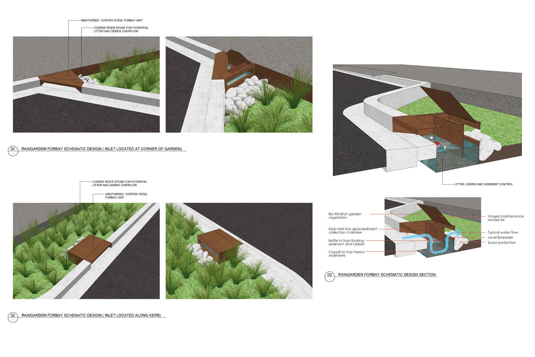 During the design phase, the client challenged the design team to develop an improved rain garden forebay design that would filter the bulk of floating rubbish and sediment out of the incoming water from the road before it entered the rain garden, thus reducing the maintenance requirements.