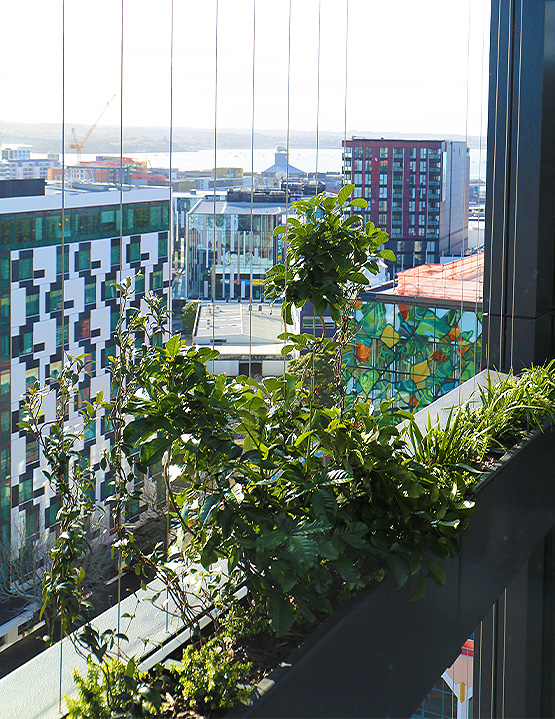 We collaborated closely with the architect, engineers, and greensystems contractor to design and implement a solid greenwall system and features at ground level and a tensile system extending up to level 12 on the western facade, offering a unique blend of nature and innovation.