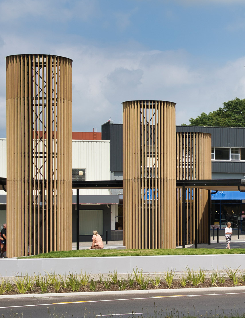 Tokoroa is a small town in the Central North Island of New Zealand. Once a thriving industry town driven by forestry and farming, people have moved to bigger centres resulting in steady decline for the town itself. The redevelopment of Leith Place provides a flexible, visually interesting space to draw people in from the adjacent motorway.