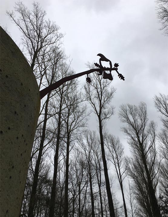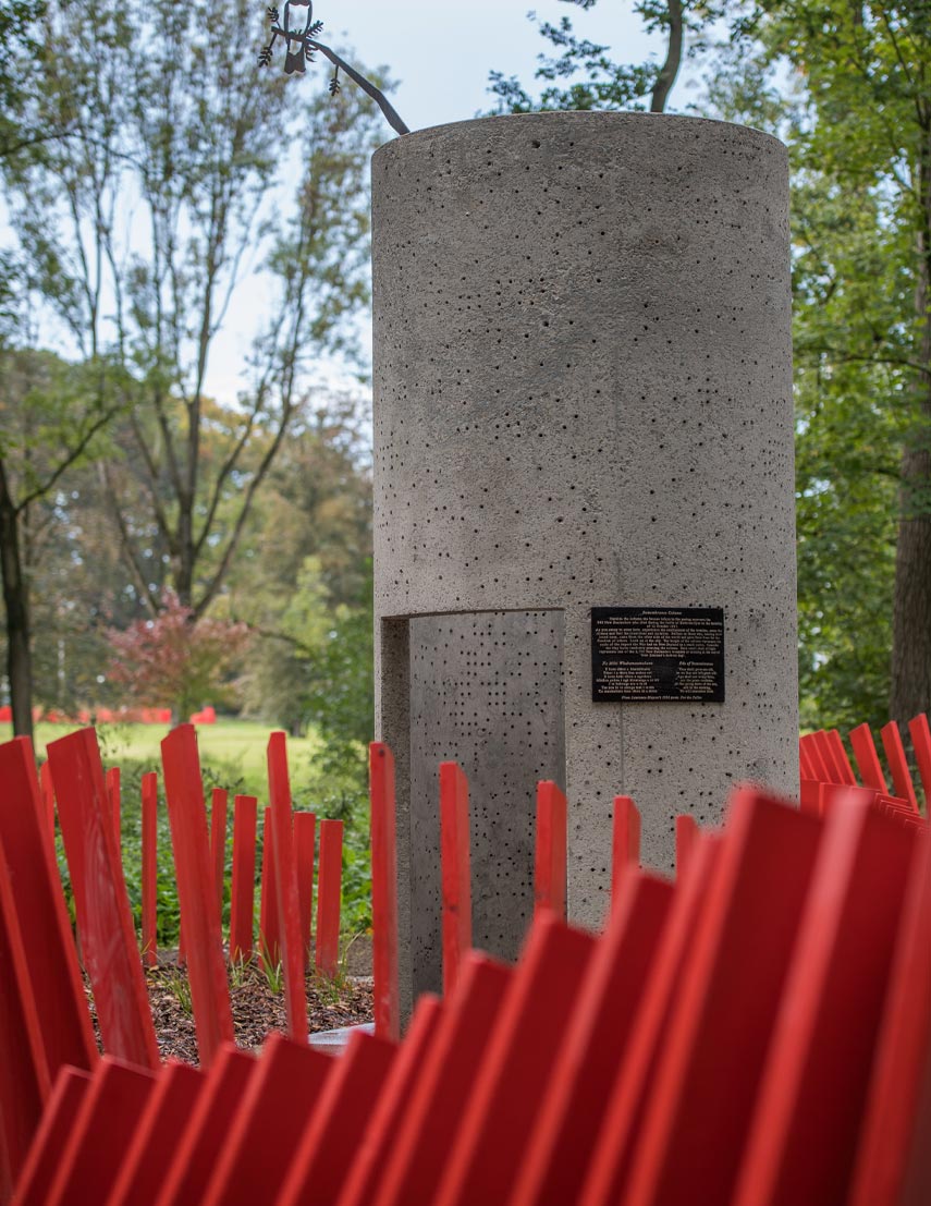 Remembrance through visual art takes the form of a concrete memory column. The scale of the door requires visitors to bend low to enter, echoing the physical confinement of the battlefield trenches. The size of the opening and internal diameter has been designed to allow a wheelchair to enter and turn around. The column is pierced by 2,700 pinholes, in a random array, representing the number of the fallen – dead, wounded and missing – at the end of the first day. Underfoot, 846 bronze inlays symbolize the New Zealand soldiers killed within the first hours of the battle.
