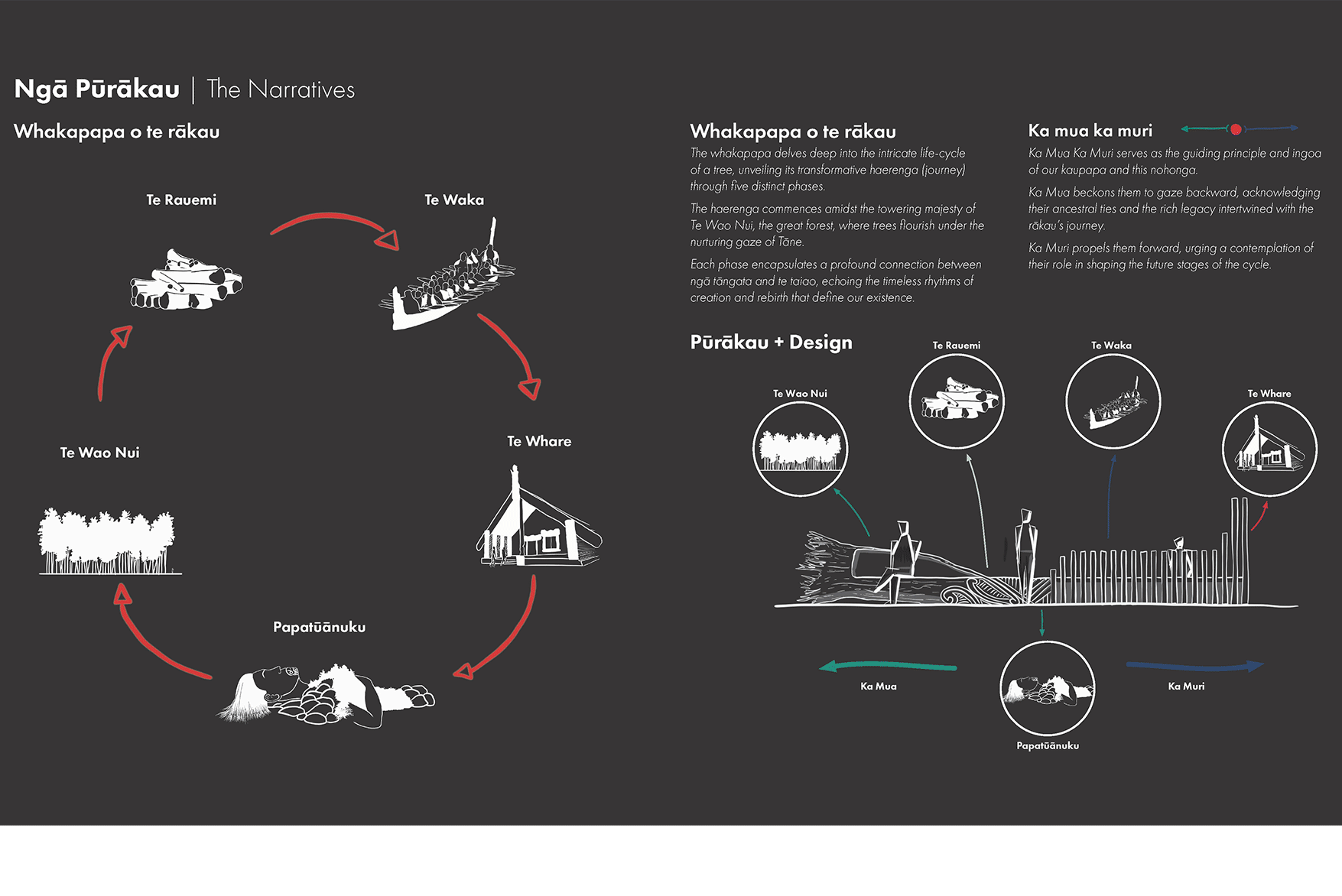 Upon reaching foreign shores, the rākau is inverted to form Te Whare, providing sanctuary and warmth for those seeking refuge. With the passage of time, the rākau gracefully returns to the embrace of Papatūānuku, completing the cycle of renewal. Each phase encapsulates a profound connection between humans and nature, echoing the timeless rhythms of creation and rebirth that define our existence.