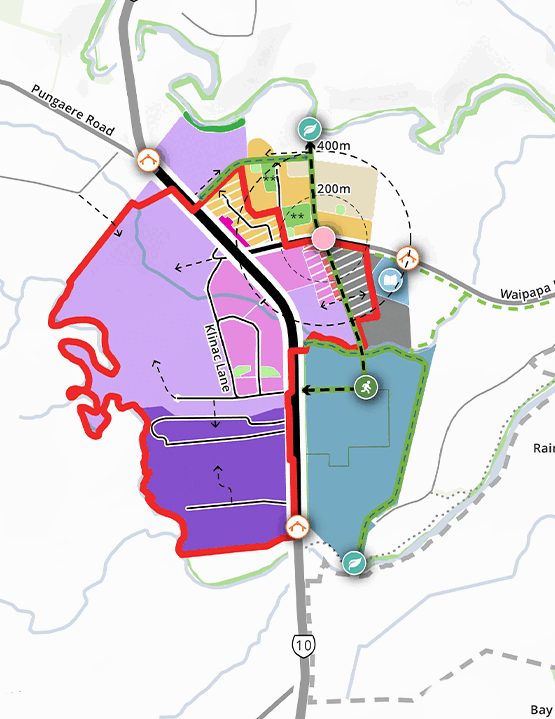 The Te Pātukurea Kerikeri Waipapa Spatial Plan addresses managing significant growth pressures, preventing excessive urban sprawl, efficiently using existing infrastructure, and ensuring that new development contributes to walkable, well‑connected neighbourhoods. Developing preferred growth scenarios required detailed urban design analysis and multidisciplinary input through a structured multi‑criteria evaluation. A core principle of the spatial plan is that most growth should occur within the existing urban footprint to create a more sustainable pattern of development over the next 30 years.