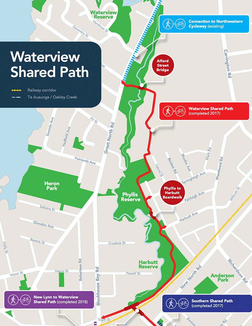 From Waterview to Ōwairaka - Mt Albert, the Waterview Shared Path forms an off-road link between two of Auckland’s major arterial routes, from the Great North Road to the New North Road near Alan Wood Reserve. The path is a component of an Auckland Council regional cycling and pedestrian network which improves access to open spaces and provides community connectivity. The shared path follows the eastern bank of Te Auaunga – Oakley Creek. In the gully below is the pedestrian-only Oakley Creek Walkway.