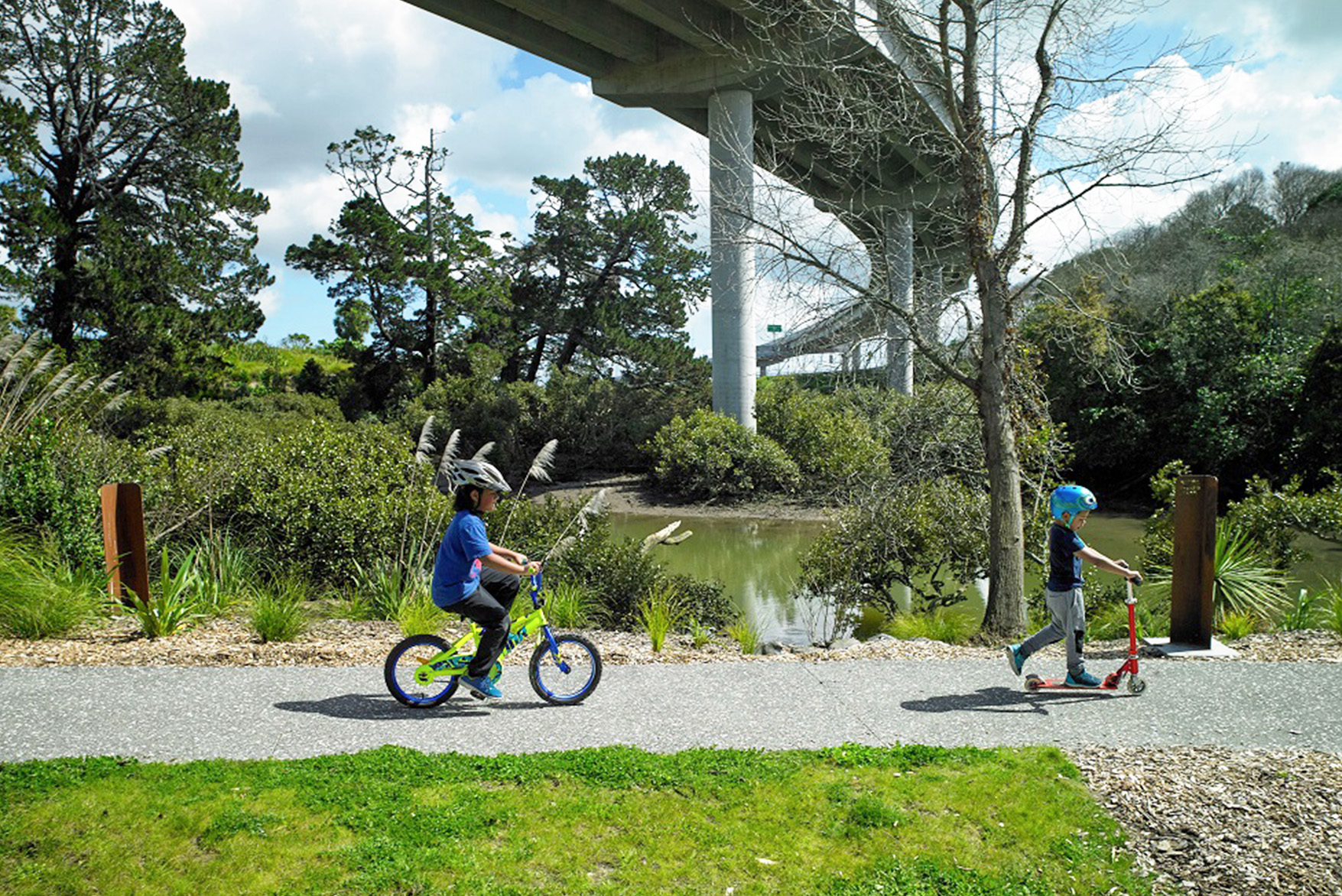 The Waterview Shared Path connects communities from Waterview to Mt Roskill with a network of cycleways. Following Te Auaunga – Oakley Creek, the 3.4 km path links the Northwestern and Southwestern Cycleways, creating a seamless connection between the city and western suburbs to Onehunga and Mangere.